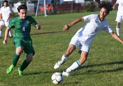 Northern Adirondack's Kingston Tucker (4) and Ashton Guay (3) battle for the ball along the sidelines to gain control. It would be a battle inside the Mountain Valley Athletic Conference of section vii as the Seton Catholic Knights would host the Northern Adirondack Bobcats at the St. Peter's field. The Bobcats would get the opening goal of the game in the final five minutes of the first half on the Caleb Damour goal to make it 1-0 Bobcats as they head into the half. When the teams came back for the second half it would stay tight but the Bobcats would expand there lead to 2-0 in the 53rd minute on the goal from Tristin Lagree with the assist going to Kyle Reif. Then just a few minutes later the Bobcats would add another to make it a 3-0 game on the Calvin Magoon goal from Austin Lambert. From there the Bobcats would hold on for the 3-0 victory as they go to 2-1 and the Knights fall to 1-1 on the early season. Gallery