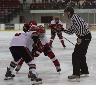 Saranac's Zack O'Connell (12) and Beekmantown's Alex Brienza (18) anticipate the drop off the puck on the in-zone face-off. Gallery