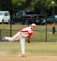 Plattsburgh State's Brian Latulipe (11)with the pick at shortstop and fires it across to first to complete the out. The Plattsburgh State Cardinals would finally open up the home portion of there season with a SUNYAC game against New Paltz. It would be a pitchers duel as the two pitchers would combine to strike out ten and give up seven hits. The lone run of the game would come in the eighth inning when David Lostagilo would hit a sacrifice fly that would score Richard Guido to give the Hawks the 1-0 lead and eventual win. In the losing effort Cardinals Joe Leddy would pitch a gem giving up one run on four hits while striking out three as the Cardinals fall t0 9-18 on the season. Gallery
