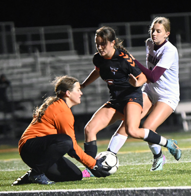 Plattsburgh's Katelyn McCormick (goalie) with the save as the attackers are coming down on the ball and at the time keeping the clean sheet. It would be Champlain Valley Athletic Conference girls's Soccer action from the Plattsburgh Athletic Complex as the Hornets would host the Northeastern Clinton Cougars. The Hornets would get the opening goal of the game in the 15th minute mark from Olivia Lamountain for the 1-0 lead. The game would stay there till the 22nd minute when the Hornets would double up their lead at 2-0 on the Amaya Abellard goal. Then in the 30th minute, the Hornets would start to put their mark on the game with Amaya Abellard's second goal of the game and that's where the first half would end. When the teams returned for the 2nd half the Cougars defense would be better as they would keep trying to get on the board. Although just a minute in the Hornets would take the 4-0 lead on the Bailey Hewson goal. The Cougars would get on the board in the closing minutes of the game but by that point, the Hornets would have control and get the 4-1 win. In the winning effort, the Hornets go to 6-1 on the season as the Cougars fall to 2-4 on the season. Gallery