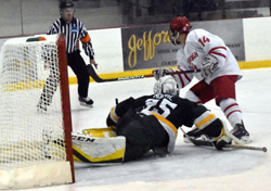 Plattsburgh State's Greg Malafronte (14) is on the doorstep trying to put away the rebound for the goal. Gallery