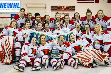 The Plattsburgh State women’s ice hockey team celebrates the 2020 NEWHL championship. The Plattsburgh State Women's hockey team won its third Northeast Women's Hockey League title, and eighth consecutive conference championship overall, with a 6-1 victory over SUNY Oswego Saturday at the Ronald B. Stafford Ice Arena. The victory earned the Cardinals an automatic berth to the NCAA Division III championship tournament, which was subsequently canceled as a result of the COVID-19 outbreak. The NEWHL Championship game began well for the visiting Lakers, who found themselves on the powerplay on six-second into the contest when senior defenseman Hannah Kirly was called for interference. While Oswego was unable to capitalize on that opportunity, the visitors took the lead at the 7:52 mark with a goal from Pliomena Teggart, assisted by Kate Rendazzo and NEWHL Rookie of the Year Megan Teachout. The Cardinals tied the contest at 10:23 when a loose puck deflected out to the top of the crease and Kaitlin Drew-Mead picked it up and put it under the pad of goaltender Rachel Farmer. Plattsburgh took the lead for good five minutes later, as Drew-Mead carried the puck into the zone and stretched around the defense to get a soft shot on Farmer, giving Sara Krauseneck the rebound opportunity for her 19th goal of the season. The home team went into the first intermission up 2-1, with a healthy 22-8 advantage in shots on goal. The defending national champions got the insurance goal at 7:06 of the second period on the powerplay, when Nicole Unsworth's shot from the left faceoff circle found the back of the net, prompting a leaping celebration from defenseman Emma Killeen. Later in the period, Kiraly found herself down low in the crease to poke at a rebound in front of Farmer and extend the Cardinals' lead to 4-1. Plattsburgh's Taylor Whitney and Annie Katonka both scored in the third period for the final tally of 6-1. Plattsburgh goaltender Ashley Davis made 20 saves in the win, while Farmer stopped 49 of the 55 shots she faced between the pipes for Oswego. With the win and subsequent cancellation of the NCAA tournament, the Cardinals finished their season with a final record of 26-1 and an 18-game winning streak. Seniors Kiraly, Sarah Wolf, and Jen Manning denied an opportunity to play for their third national title, finished with a career record of 107-8-3. Gallery