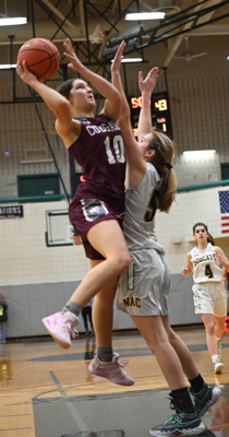 Northeastern Clinton's Bailee Lafountain (10) charges down the lane for the hoop as Bobcats Isabella Gillmore (5) stays on the hip as she rises up. It would be the opening game of championship Sunday for Section VII Basketball and it would feature the top two seeds from Class C on the Girl's side as the #2 Northeastern Clinton Cougars and the #1 Northern Adirondack Bobcats. The Cougars would get off to a quick start in the game and take a 14-3 lead after the first quarter. In the second quarter, the Bobcats would get their shot going although it wouldn't be good enough as the Cougars would have a 13-10 quarter and take a 27-13 lead into the intermission. When the teams returned for the third quarter the Cougars would stay hot and have a 14-9 quarter and take a 41-22 lead into the fourth. In that quarter the Cougars would fall back and use the clock to their advantage and have a 9-8 quarter for the 49-29 victory. With the win, the #7 Northeastern Clinton Cougars advance to the NYSPHSAA Tournament and will take on #3 Greenwich on March 8th in the opening round of the tournament. Gallery