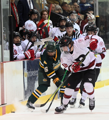 Plattsburgh State's Shane Bondy (16) picks the from along the boards and races in on the attack. It would be the classic rivalry from the sold-out Ronald B Stafford Ice Arena as the Plattsburgh State Cardinals would host the Oswego State Lakers in SUNYAC Men's Hockey action. The game would start well for the home Cardinals as they would get the game's opening goal just 3:51 in on the power play goal from Tyler Ramm to make it a 1-0 Cardinals lead. The game would stay there till there was 2:38 left in the first period when Shane Bondy would make it a 2-0 game on the powerplay goal, and that's where the first period would end. When the teams returned for the second period, the Lakers would get on the board at 6:38, and Matt McQuade scored at 6:38. The Lakers would come back and tie the game at two on the powerplay goal from Brandon Cohen at the 14:03 mark of the period, and that's where the second period would end. The Cardinals would come out on fire and retake the lead at 3-2 on Tyler Ramm's second goal of the game on the powerplay at the 2:57 mark. The lead would be short-lived as the Lakers would tie the game back up at three on the Daniel Colabufo goal at 4:23. Then, just 91 seconds later, the Lakers would regain their lead at 4-3 on Brandon Cohen's second goal of the game. Then, at the 10:57 mark of the period, the Lakers would take control of the game on Matt McQuade's second goal to make it a 5-3 game, and that's where the game would end. In the winning effort for the Lakers, Brandon Milberg made 20 saves on the night, and they went to 11-6-3 in the season. As for the Cardinals, Jacob Hearne would make 18 saves as they fall to 10-9-1 on the season and head into their next match against Morrisville State on Friday night. Gallery