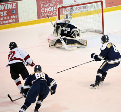 SUNY Canton's Nate Hopkins (30) stopped on Plattsburgh State's Jack Ring (22) for one of 23 saves in the shutout victory, It would be a north country battle inside the SUNYAC Conference as the Plattsburgh State Cardinals would host the Canton Kangaroos from the Ronald B Stafford Ice Arena in front of 1200 fans. There would be no scoring in the first period as defense would be the name of the game, as the teams would combine for 15 shots in the period. In the second period, the Kangaroos would break through and get the opening goal at the 6:15 mark,ewhichewascKinnon would score and anchor 1-0. The Kangaroos would keep coming, adding a shorthanded goal at the 11:19 mark of the period when Jackson Drysdale would light the lamp and make it a 2-0 game. In the third period, the Cardinals would have their best offensive period of the night as they would have nine shots on the net and pull the goalie with about three minutes left in the net, but they would not be able to find the back of the net on this day. The Canton Kangaroos would pull off the 2-0 upset on the evening as Nate Hopkins would make 23 saves in a shutout victory as they go to 6-12-1 on the season and take on neighbor the Potsdam State Bears tomorrow night. As for the Cardinals, they will fall to 10-8-1 on the season as Jacob Hearne makes 24 saves, not the night, and they will be back in action tomorrow night as they take on rival Oswego State. Gallery