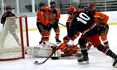 Northeastern Clinton's Lucas Beard (17) fights through a pair of Plattsburgh's Ryan Knowles (24) and Bostyn Duquette (4) on the way to the net. It would be the third meeting of the week between the Northeastern Clinton Cougars and Plattsburgh Hornets this time at Ameri-can North Arena and the Hornets would be looking to get a win in the series. It would not start off very good for the Hornets as the Northeastern Clinton Cougars Sam Boulton just 14 seconds into the game to make it 1-0. Then the Cougars would strike again at the 4:50 mark of the first period on Sam Boulton's second goal of the game and take a 2-0 lead. Then just two minutes later at the 6:47 mark, the Cougars would score again to make it 3-0 on the Lucas Beard goal and that's where the first period would end. When the teams came back for the second period the Hornets would get on the board at the 1:40 mark on the Bostyn Duquette goal to make it 3-1. Then in the final 2 minutes of the second period, the Cougars would regain their three-goal lead at 4-1 on the Ryan Racine goal. In the third period, the Hornets would give themself hope as Jace Lacey would score at the 5:17 mark to make it a 4-2 game. Although just over two minutes later the Cougars would take the three-goal lead again at 5-2 on Lucas Beard's second goal of the game. Then in the closing minute of the game Cougars would put the icing on the cake on the Kai Britz goal to secure the 6-2 victory. In the winning effort, the Cougars would stay undefeated at 3-0 while the Hornets would fall to 0-3 still looking for that first win of the season. Next week the teams will be having three-game series again the Northeastern Clinton Cougars play the Saranac Chiefs and the Plattsburgh Hornets and Beekmantown Eagles meet up. Gallery.